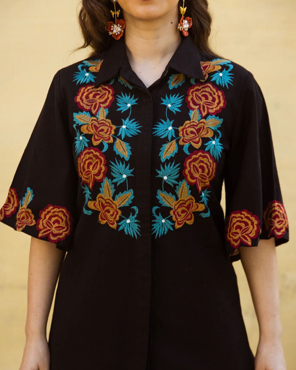 The top features a clean front button closure and elbow-length sleeves, delicately highlighted with embroidery for a graceful finish. Intricate floral motifs adorn the front, adding a vibrant yet tasteful contrast against the black base. The tailored silhouette ensures a flattering and polished look suitable for multiple occasions.