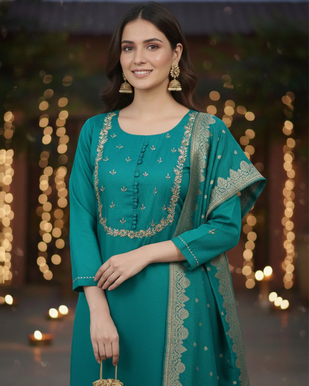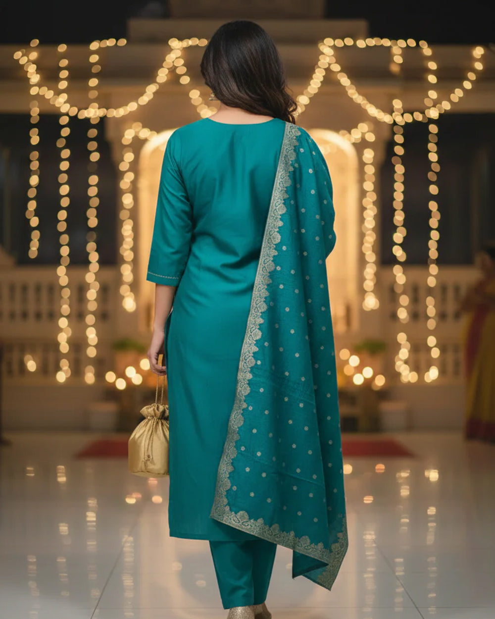 The sleeves are finished with gota lace detailing, lending a subtle festive touch while keeping the silhouette graceful and comfortable.
