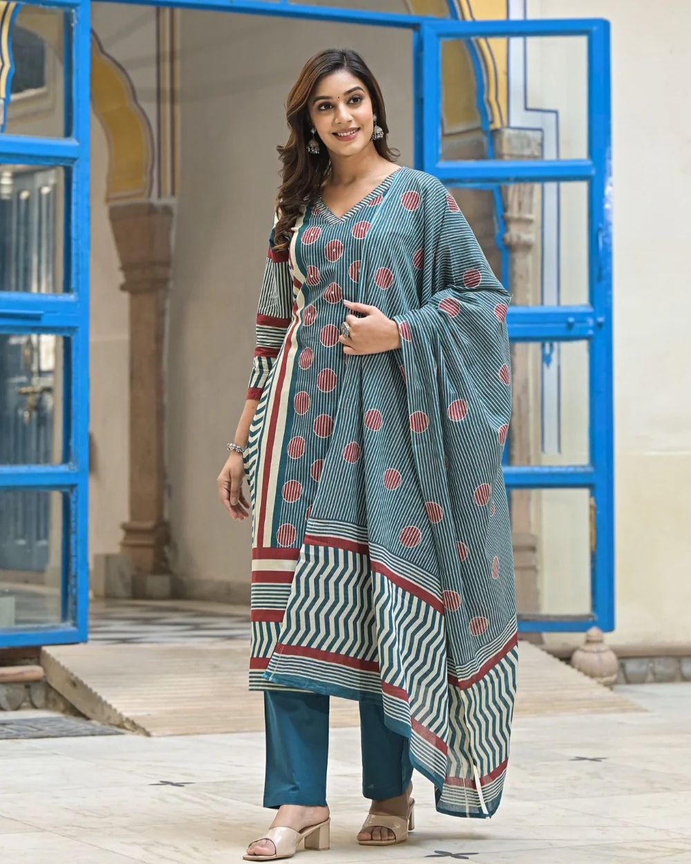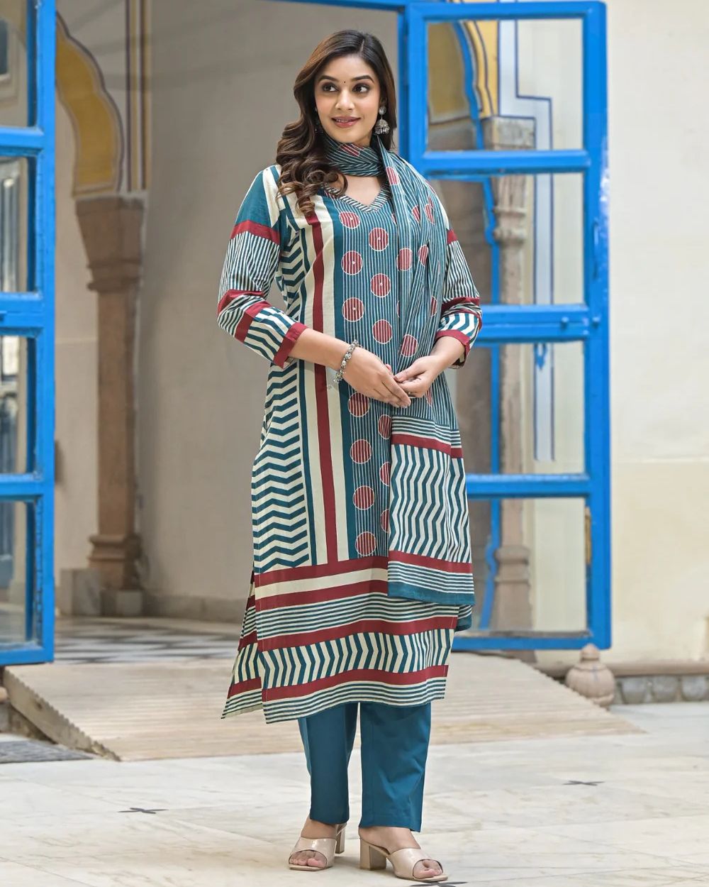 Elegant Teal Blue Ajrakh print suit set crafted in soft, premium-quality cotton, perfect for everyday elegance and comfortable all-day wear. The kurta features a beautiful mix of traditional Ajrakh-inspired motifs with a flattering silhouette.